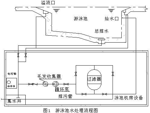 游泳池池水從池底部排水管和池岸溢水管流出,通過(guò)各控制閥門(mén)在機(jī)房匯合,經(jīng)投藥器加沉淀劑后,通過(guò)毛發(fā)收集器進(jìn)行粗過(guò)濾,然后再由水泵把水找入過(guò)濾器項(xiàng)部,水經(jīng)過(guò)過(guò)濾材料過(guò)濾后,從過(guò)濾器底部流出后的干凈水再經(jīng)過(guò)投藥泵加消毒劑后,由泳池池壁的給水口均勻注于池中,《游泳池水處理流程圖見(jiàn)下圖》