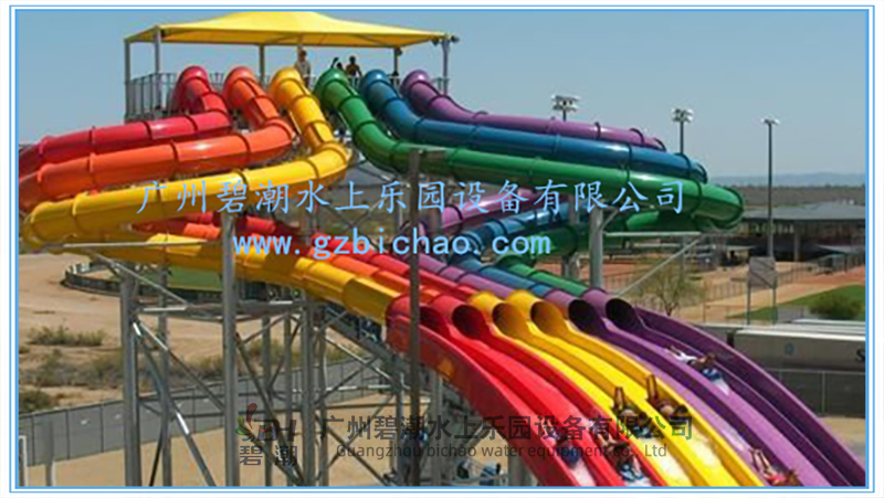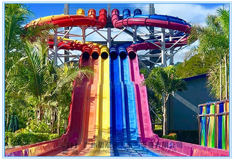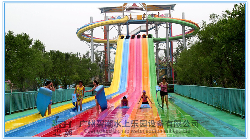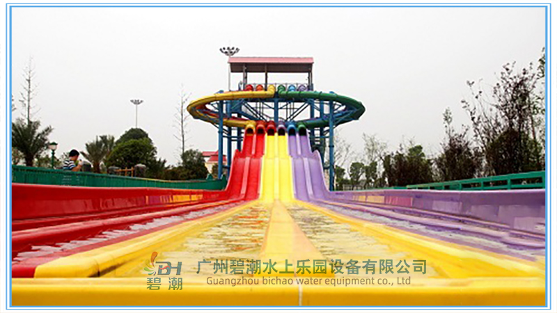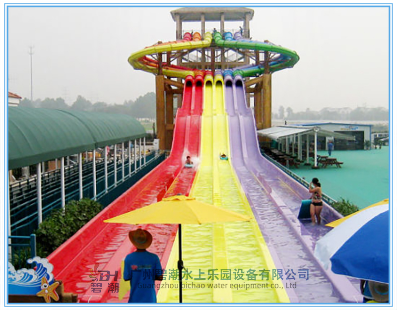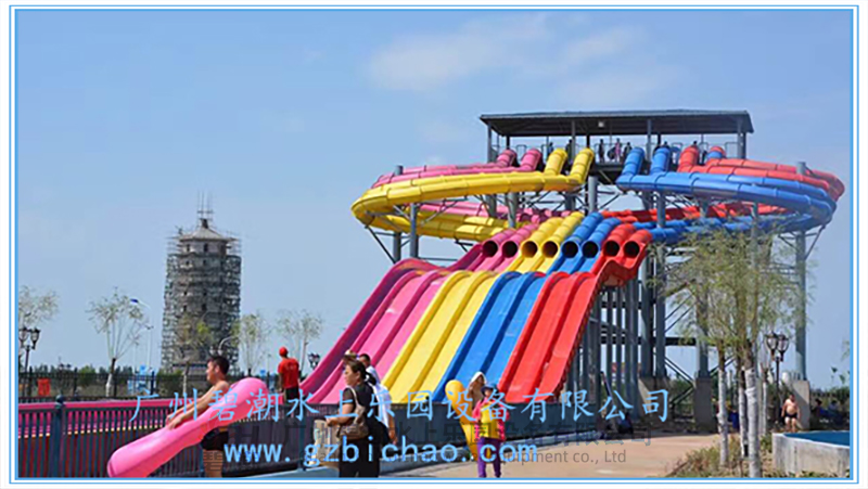 水上樂(lè)園設(shè)備競(jìng)賽滑梯同樣是一類非常經(jīng)典的水上樂(lè)園游玩水滑梯,多可以多道并列設(shè)計(jì),一般為3~8道,可以用身體或浮墊滑行。參與者可以同時(shí)出發(fā)進(jìn)行比賽,滑道中間會(huì)設(shè)計(jì)一系列刺激的小坡,參與者們都將一一通過(guò)它們,最終沖向終點(diǎn)線。該設(shè)備的參與和互動(dòng)性非常強(qiáng),同時(shí)具有很強(qiáng)的接待能力,讓游客可以多次參與到比賽當(dāng)中,獲取歡樂(lè)和暢快的獨(dú)特體驗(yàn)。 滑梯的高度可以從幾米到幾十米都可以做,常用的滑梯內(nèi)寬為0.6米,多道組合并用。