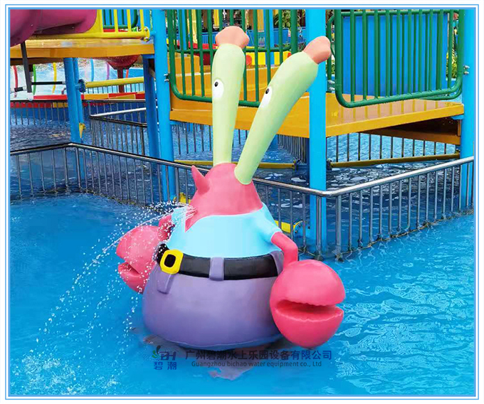 水上樂園設(shè)備蟹老板噴水以動畫片《海綿寶寶》蟹老板的造型設(shè)計,是一只螃蟹,本名蟹阿金。一個吝嗇但又時時充滿愛心的蟹老板,在設(shè)計師充滿想象力的巧手下化為水上樂園的戲水小品,這樣的戲水小品非常適合安裝在水上樂園的兒童戲水池中作為戲水設(shè)備。